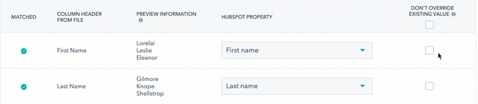 - 特定の個々のプロパティーの既存の値を持つレコードを更新したくない場合、インポートによってレコードのそれらのプロパティーが上書きされないようにするには、対象のプロパティーの[既存の値を上書きしない]チェックボックスをオンにします。