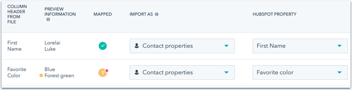 - 既存のプロパティーにマッピングされていない列がある場合は、[HubSpotプロパティー]でドロップダウンメニューをクリックします。ドロップダウンメニューで、次のいずれかの操作を選択できます。